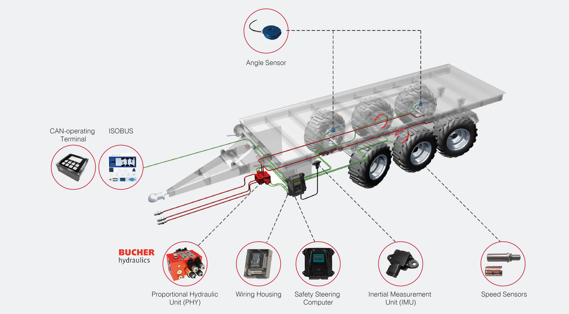 It enables controlled axle steering without a mechanical linkage between the tractor and trailer, offering flexible steering behaviour across a range of applications.